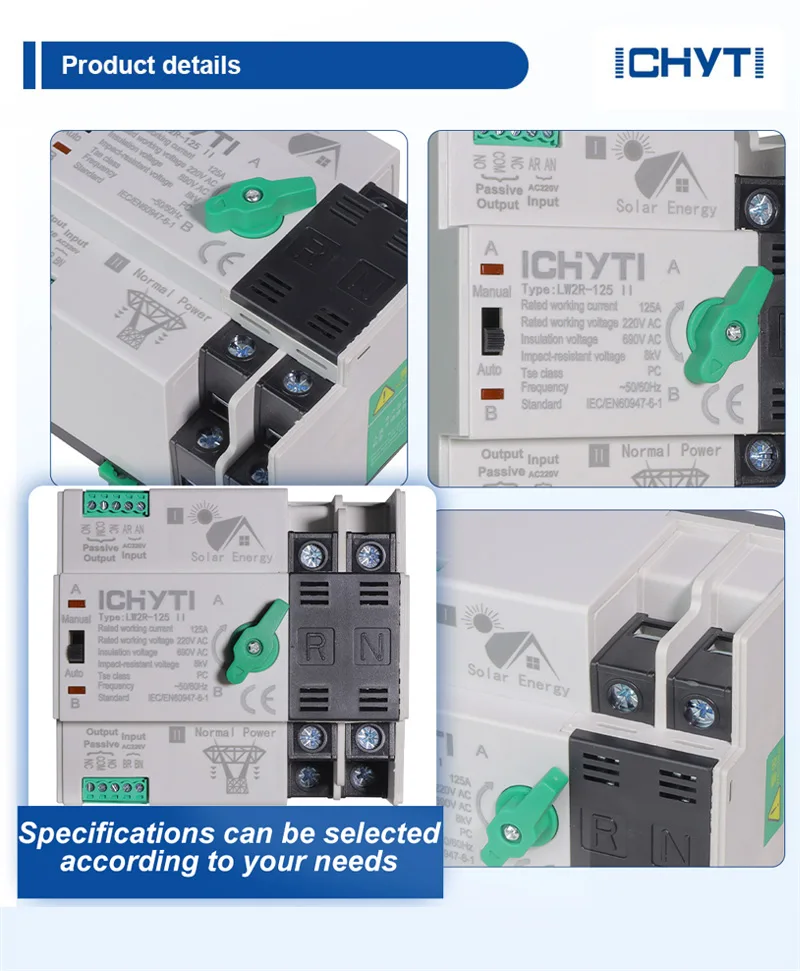 ICHYTI dual power automatisk overførselskontakt kan tilpasses, og du kan købe den med tillid. Vi ser frem til at arbejde sammen med dig og give dig mere information. Hvis du har spørgsmål, er du velkommen til at kontakte os til enhver tid. Vores laboratorium er designet i henhold til IEC internationale standarder og opfylder alle krav til produkttest.