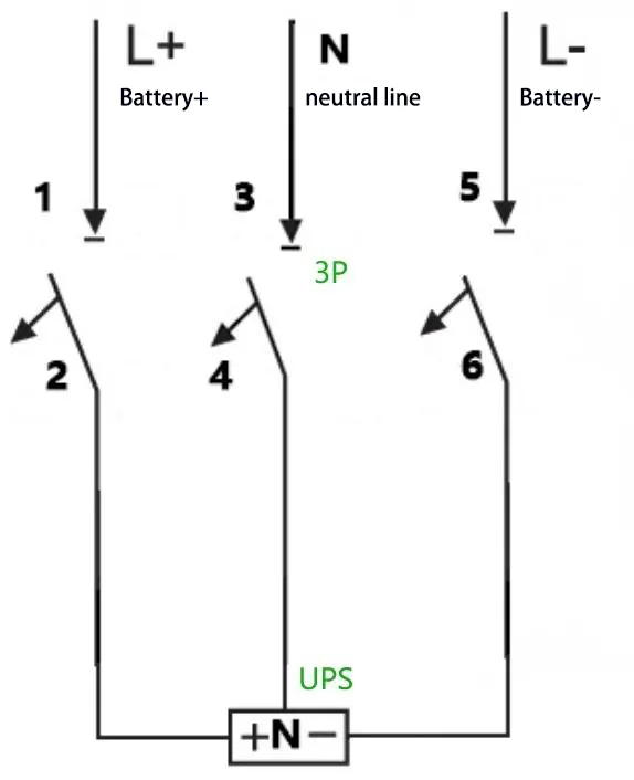 E:For eksempel: For en UPS med en kapacitet på 40 kVA, en nominel batteristreng på 40 celler og neutral ledningsforbindelse (udlignende ladespænding: 14 V × 40 = 560 V, dvs. ±280 V), beregnes den maksimale driftsstrøm som 40 kVA × 1,0 V A ÷ 10 % ÷ 10 % ÷ 10 % ÷ 10 % . 4P 750 V 150 A afbryder kan anvendes, med to af dens poler forbundet i serie. Ledningsmetoden er som følger: