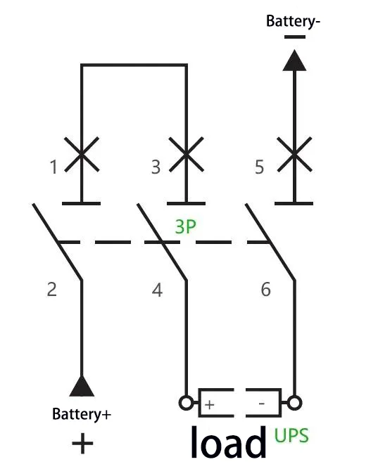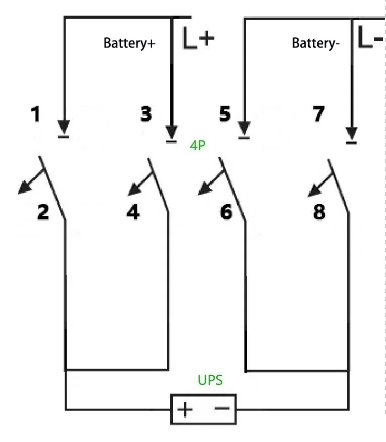 C:For eksempel: For en UPS med en kapacitet på 40 kVA og en nominel batteristreng på 40 celler (udlignende ladespænding: 14 V × 40 = 560 V), er den maksimale driftsstrøm beregnet til 40 kVA × 1,0 ÷ 90% ÷ 10 V ÷ 40 = 3P 5 kredsløb kan være A 50 A 50 7 kredsløb. vedtaget, med to af dens poler forbundet i serie. Ledningsmetoden er som følger:
